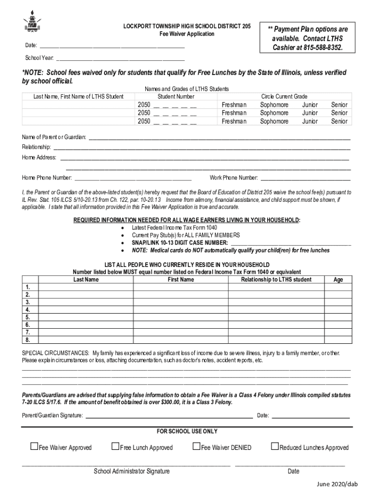 The wwwlthsorg43fee-waiver-applicationlockport Township High School fee waiver application is intended for students or their parents/guardians who are facing financial hardship and need assistance with paying various fees associated with their education.