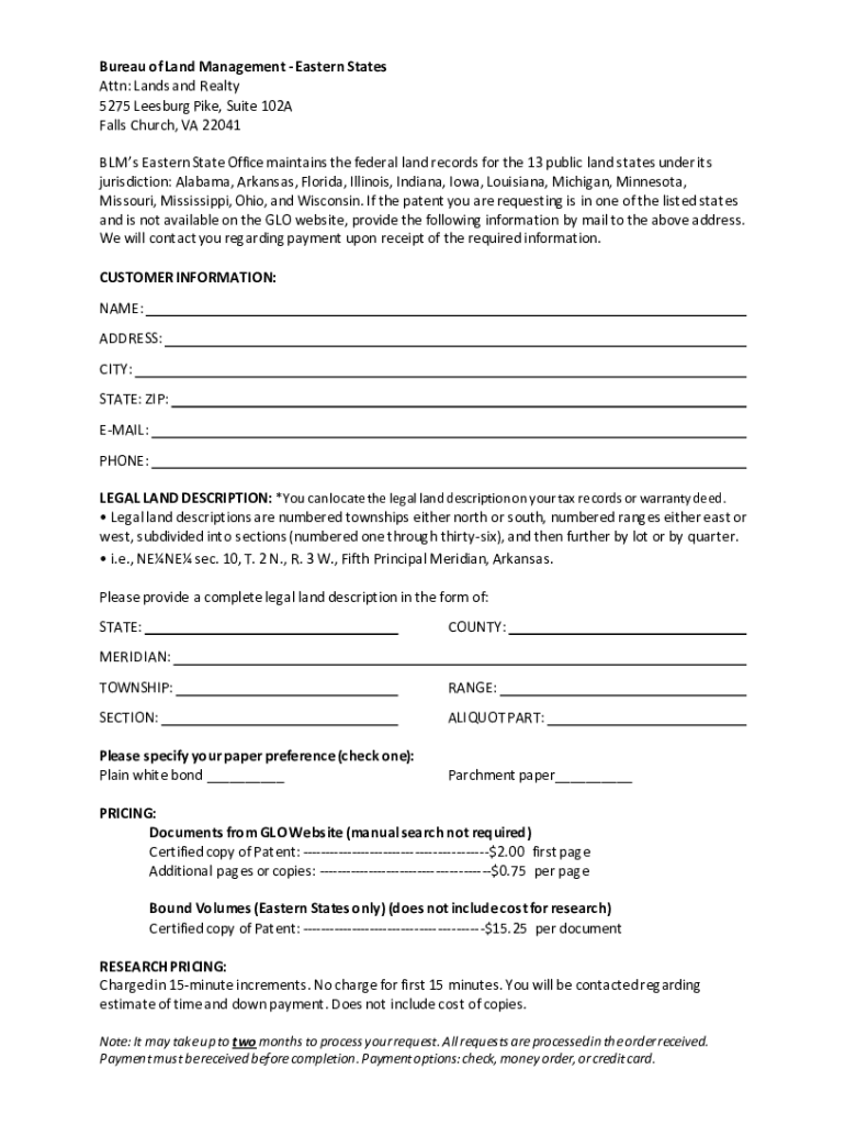 Bureau of Land Management Eastern States Attn: Lands and Realty 5275 Leesburg Pike, Suite 102A Falls Church, VA 22041 BLM's Eastern State Office maintains the federal land records for the 13 public