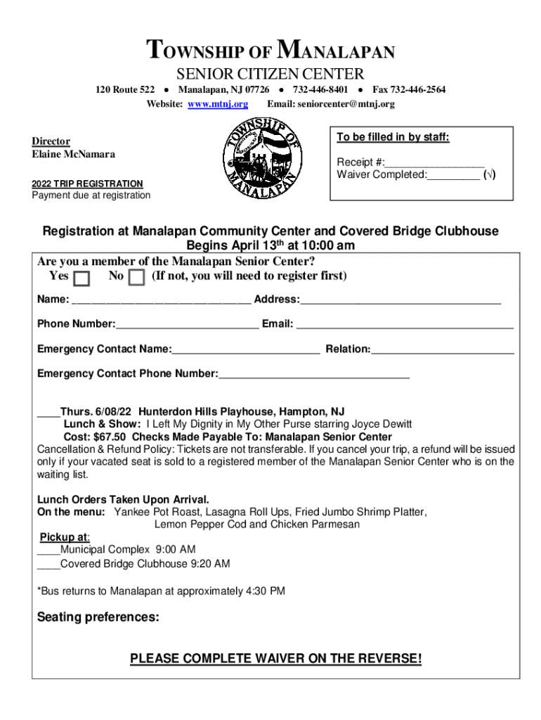 TOWNSHIP OF MANALAPAN SENIOR CITIZEN CENTER 120 Route 522 Manalapan, NJ 07726 7324468401 Fax 7324462564 Website: www.mtnj.org Email: senior center×MTN.onto be filled in by staff:Director Elaine McNamara