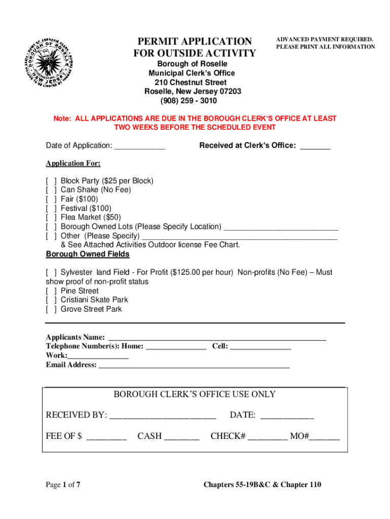 PERMIT APPLICATION FOR OUTSIDE ACTIVITYADVANCED PAYMENT REQUIRED. PLEASE PRINT ALL INFORMATIONBorough of Roselle Municipal Clerks Office 210 Chestnut Street Roselle, New Jersey 07203 (908) 259 3010