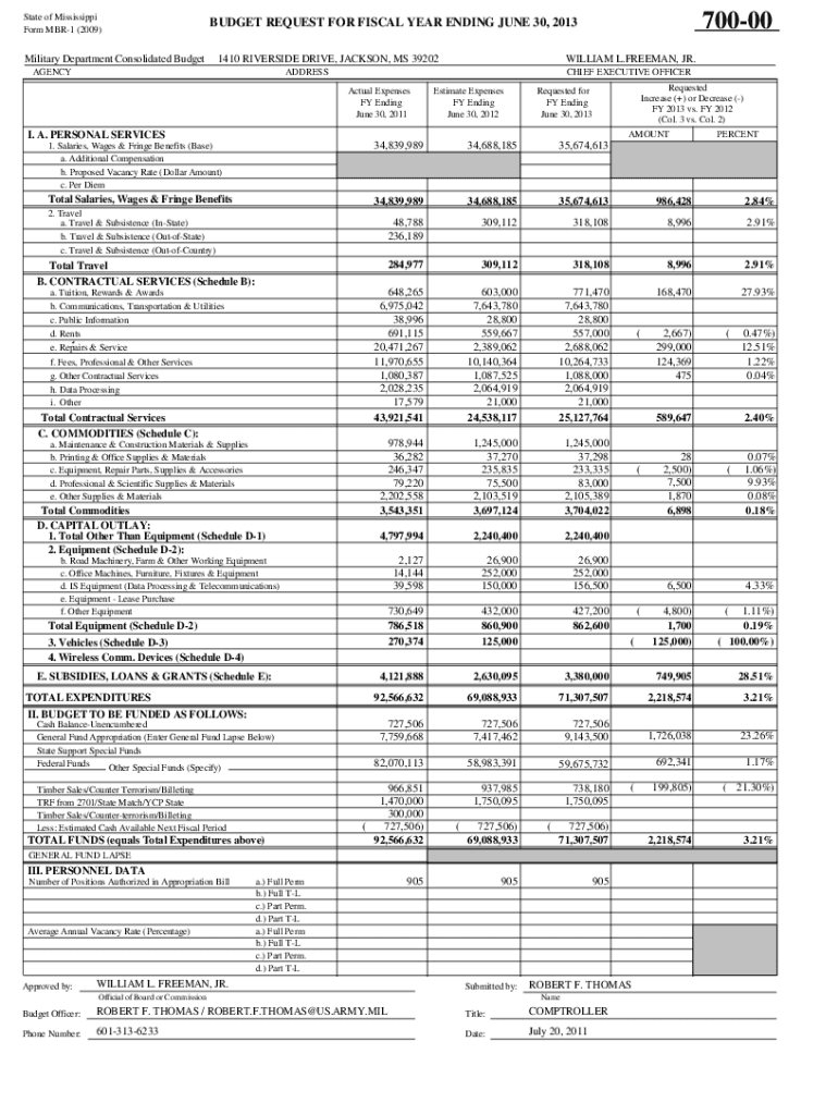 State of Mississippi Form MBR1 (2009)70000BUDGET REQUEST FOR FISCAL YEAR ENDING JUNE 30, 2013Military Department Consolidated Budget1410 RIVERSIDE DRIVE, JACKSON, MS 39202AGENCYWILLIAM L.FREEMAN,