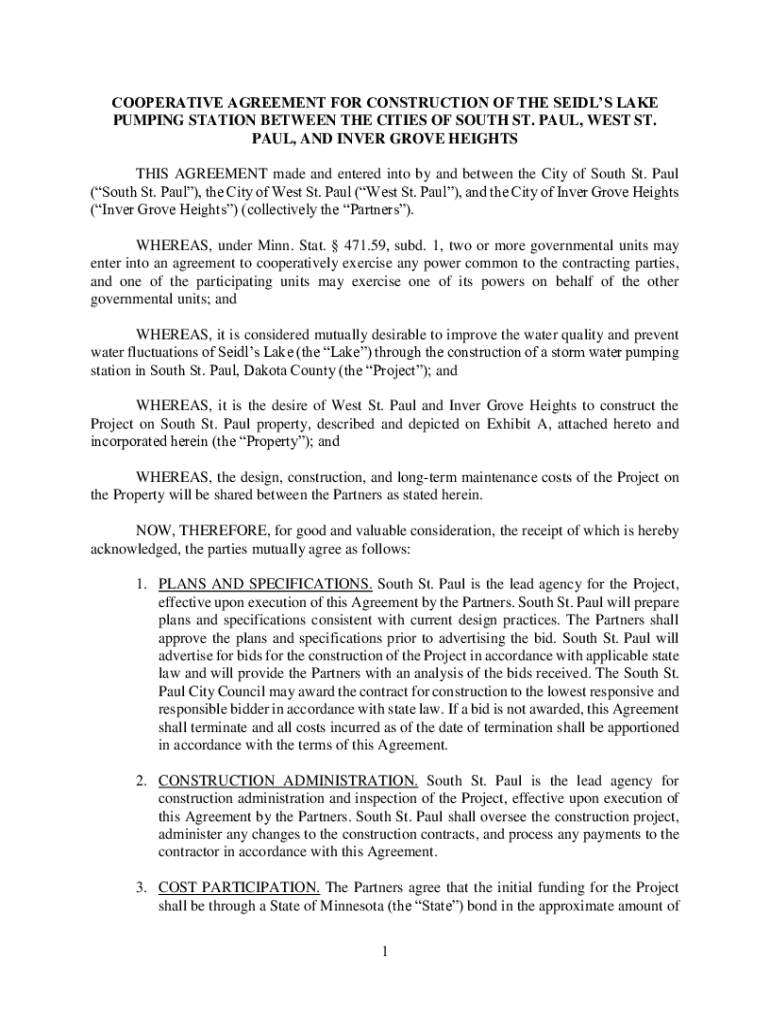 COOPERATIVE AGREEMENT FOR CONSTRUCTION OF THE SIDES LAKE PUMPING STATION BETWEEN THE CITIES OF SOUTH ST. PAUL, WEST ST. PAUL, AND INNER GROVE HEIGHTS THIS AGREEMENT made and entered into by and between