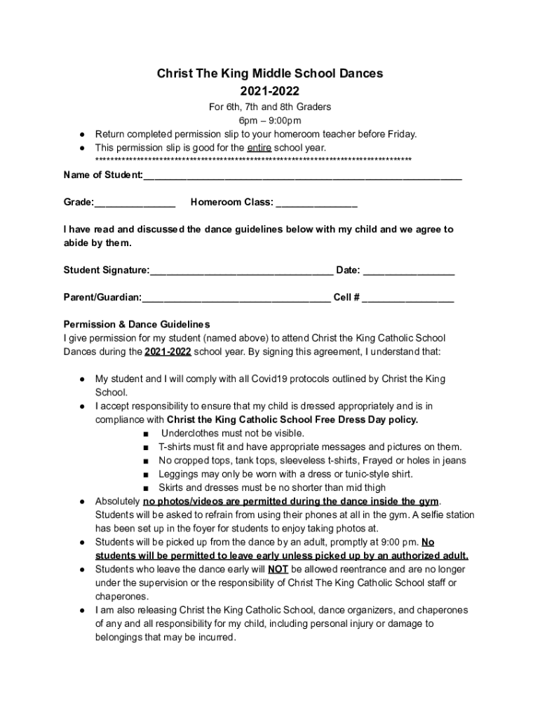 Christ The King Middle School Dances 20212022 For 6th, 7th and 8th Graders 6pm 9:00pm Return completed permission slip to your homeroom teacher before Friday. This permission slip is good for the