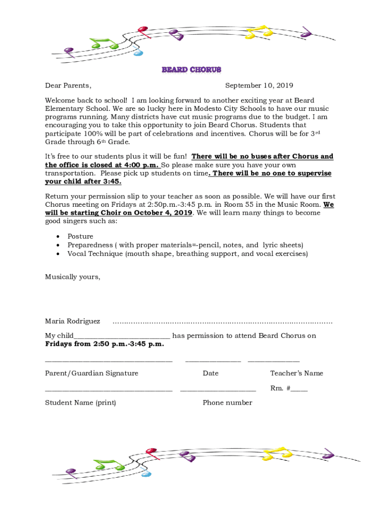 Dear Parents, September 10, 2019Welcome back to school! I am looking forward to another exciting year at Beard Elementary School. We are so lucky here in Modesto City Schools to have our music programs