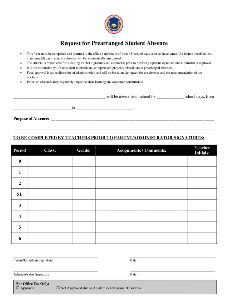 Request for Prearranged Student Absence This form must be completed and returned to the office a minimum of three (3) school days prior to the absence. If a form is received less than three (3) days