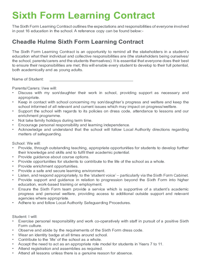 Sixth Form Learning Contract The Sixth Form Learning Contract outlines the expectations and responsibilities of everyone involved in post 16 education in the school. A reference copy can be found