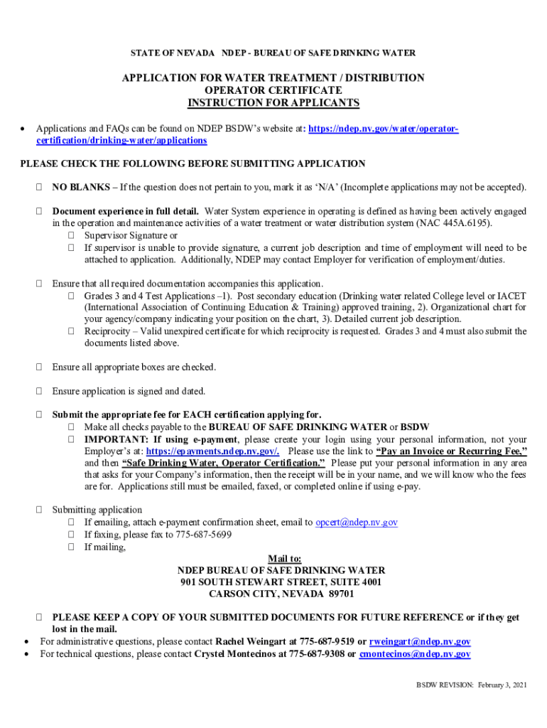 STATE OF NEVADA NEP BUREAU OF SAFE DRINKING WATERAPPLICATION FOR WATER TREATMENT / DISTRIBUTION OPERATOR CERTIFICATE INSTRUCTION FOR APPLICANTS Applications and FAQs can be found on NEP BSDs website
