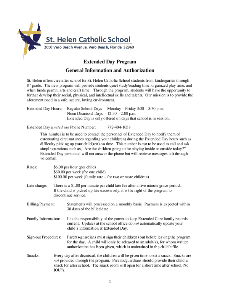 St. Helen Catholic School 2050 Vero Beach Avenue, Vero Beach, Florida 32960Extended Day Program General Information and Authorization St. Helen offers care after school for St. Helen Catholic School