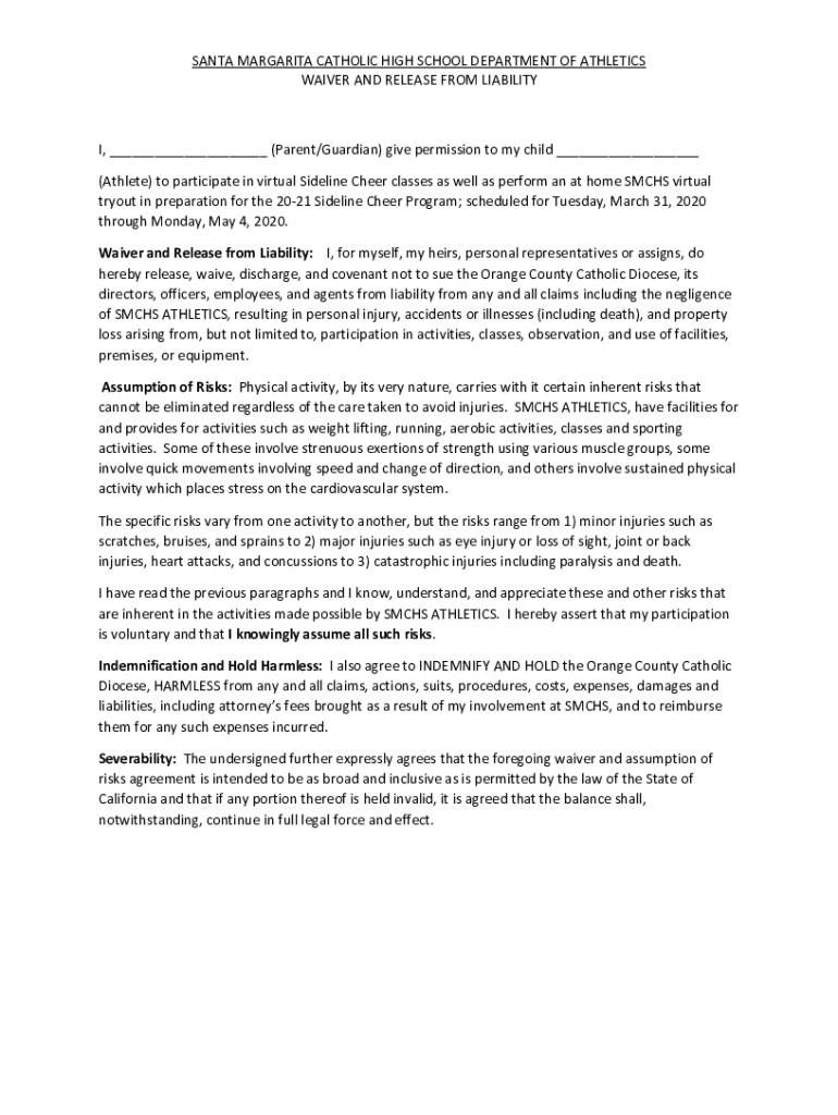 SANTA MARGARITA CATHOLIC HIGH SCHOOL DEPARTMENT OF ATHLETICS WAIVER AND RELEASE FROM LIABILITY, ___ (Parent/Guardian) give permission to my child ___ (Athlete) to participate in virtual Sideline Cheer