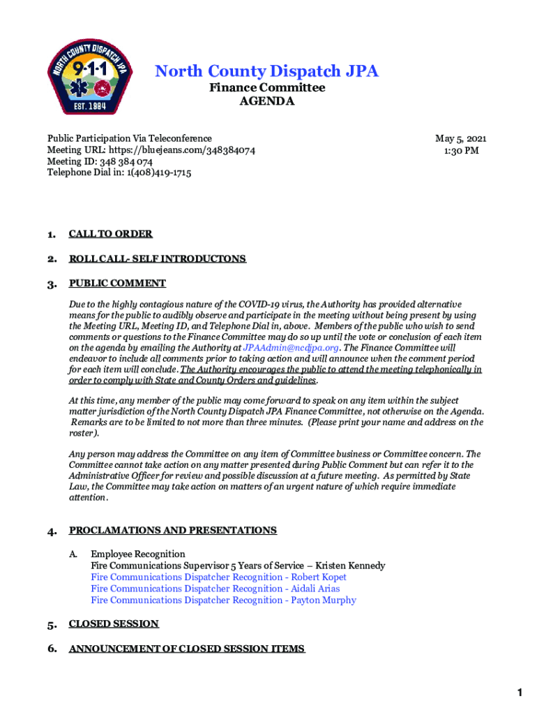 North County Dispatch JPA Finance Committee AGENDA Public Participation Via Teleconference Meeting URL: https://bluejeans.com/348384074 Meeting ID: 348 384 074 Telephone Dial in: 1(408)41917151.CALL