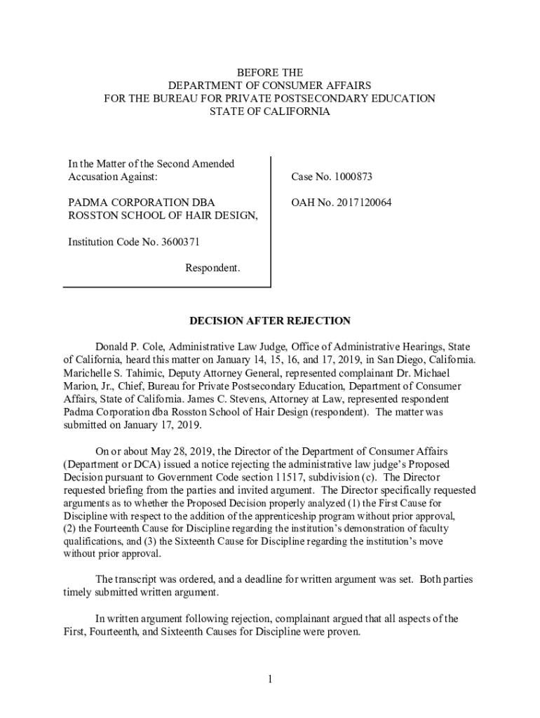 BEFORE THE DEPARTMENT OF CONSUMER AFFAIRS FOR THE BUREAU FOR PRIVATE POSTSECONDARY EDUCATION STATE OF Californian the Matter of the Second Amended Accusation Against:Case No. 1000873PADMA CORPORATION