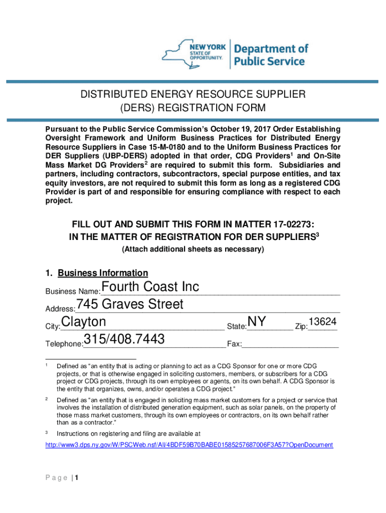 FOURTH COAST INC A NYS Certified Woman Business Enterprise (WE)745 GRAVES STREET CLAYTON, NEW YORK 13624 315/408.744303 November 2020Honorable Michelle L Phillips Secretary of the Commission New York