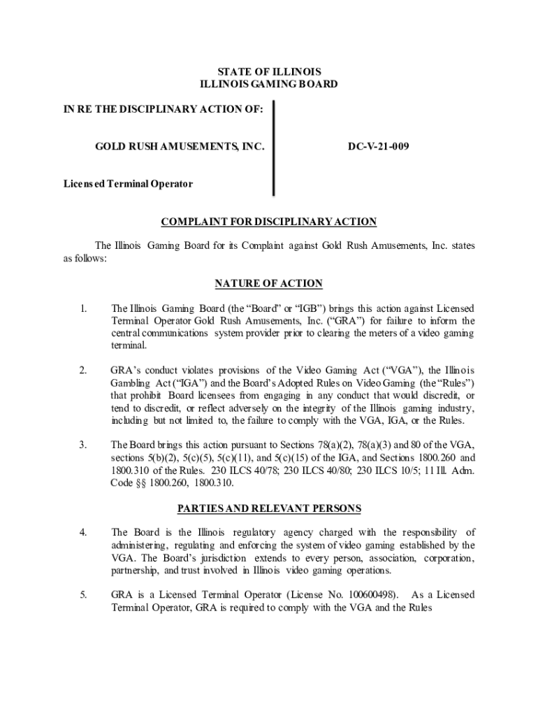 STATE OF ILLINOIS GAMING BOARD IN RE THE DISCIPLINARY ACTION OF: GOLD RUSH AMUSEMENTS, INC.DCV21009Licensed Terminal Operator COMPLAINT FOR DISCIPLINARY ACTION The Illinois Gaming Board for its Complaint
