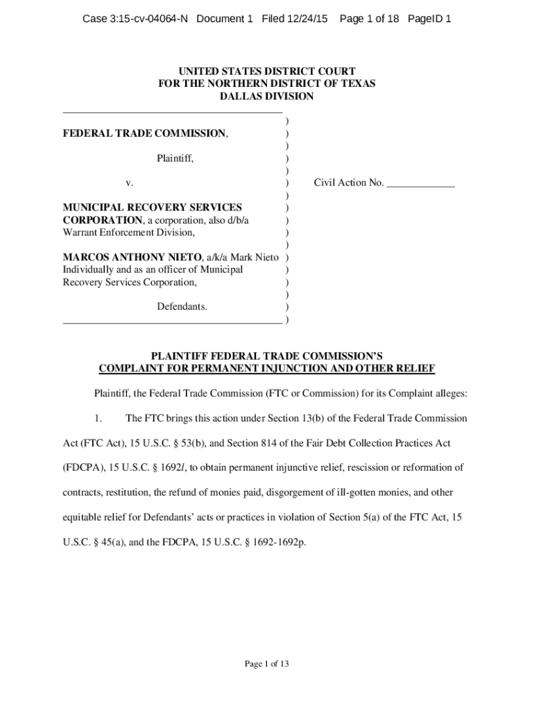 Case 3:15cv04064N Document 1 Filed 12/24/15Page 1 of 18 Paged 1UNITED STATES DISTRICT COURT FOR THE NORTHERN DISTRICT OF TEXAS DALLAS DIVISION ___) FEDERAL TRADE COMMISSION, ) ) Plaintiff, ) ) v.)