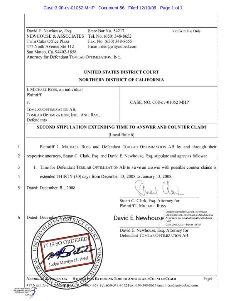 Case 3:08cv01052MHP Document 56 Filed 12/10/08-Page 1 of 1David E. New house, Esq. State Bar No. 54217 REHOUSE & ASSOCIATES Tel. No. (650) 3488652 Twin Oaks Office Plaza Fax. No. (650) 3488655 477