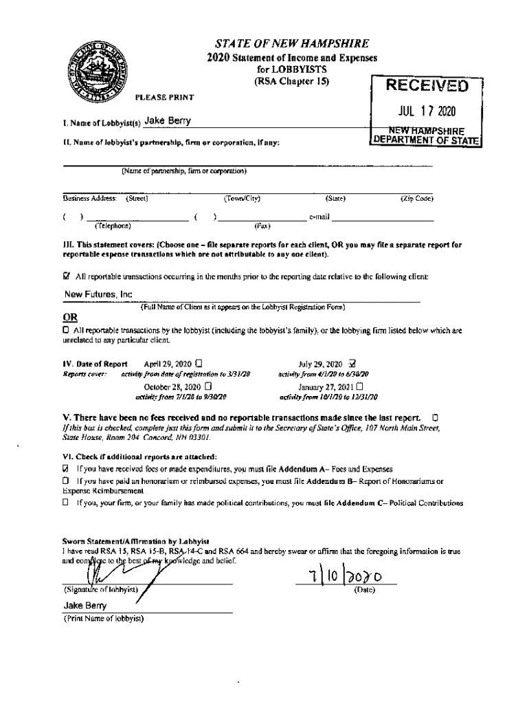 STATE OF NEW HAMPSHIRE2020 Statement of Income and Expenses for LOBBYISTS(RSA Chapter 15)RECEIVEDPLEASE PRINTOUT 1 7 2020 I. Name of Lobbyist(s)Baby NEW HAMPSHIRE DEPARTMENT OF STATE. Name of lobbyist\'s