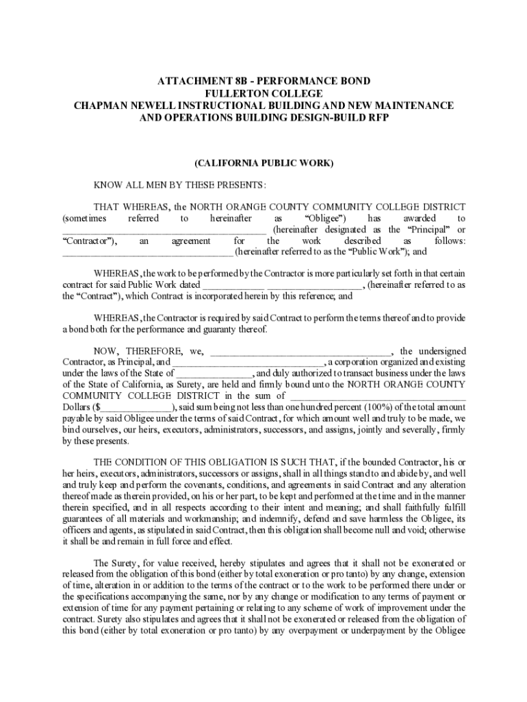 ATTACHMENT 8B PERFORMANCE BOND FULLERTON COLLEGE CHAPMAN NEWELL INSTRUCTIONAL BUILDING AND NEW MAINTENANCE AND OPERATIONS BUILDING DESIGNBUILD RFP(CALIFORNIA PUBLIC WORK) KNOW ALL MEN BY THESE PRESENTS: