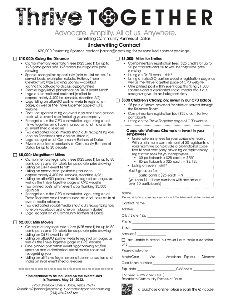 Benefiting Community Partners of DallasUnderwriting Contract $20,000 Presenting Sponsors: contact Joanna×codex.org for personalized sponsor package. $10,000: Going the Distance Complimentary registration