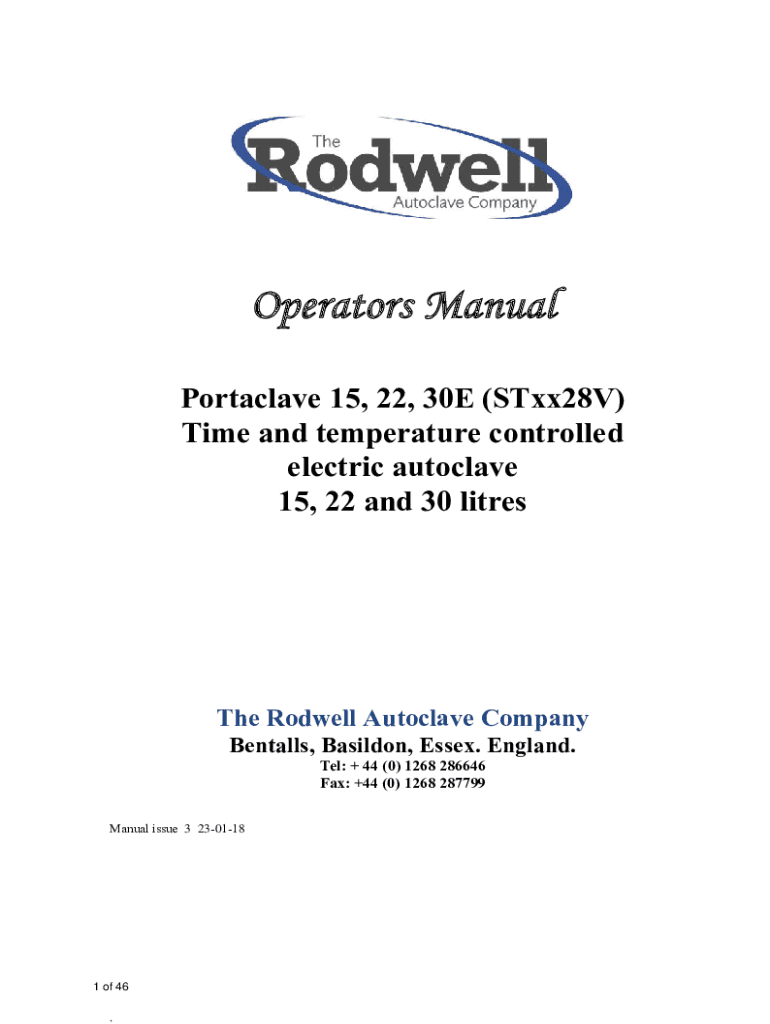Operators Manual Portable 15, 22, 30E (STxx28V) Time and temperature controlled electric autoclave 15, 22 and 30 literate Roswell Autoclave Company Mentally, Basil don, Essex. England. Tel: + 44 (0)