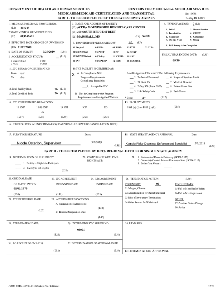 DEPARTMENT OF HEALTH AND HUMAN SERVICES CENTERS FOR MEDICARE & MEDICAID SERVICES MEDICARE/MEDICAID CERTIFICATION AND TRANSMITTAL ID: 8N38 PART I TO BE COMPLETED BY THE STATE SURVEY AGENCY Facility