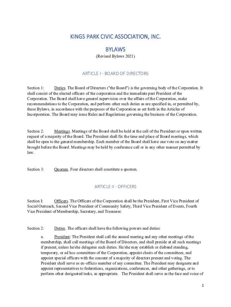 KINGSPARKCIVICASSOCIATION, INC. BYLAWS (Revised Bylaws 2021)ARTICLEIBOARDOFDIRECTORS Section 1: Duties. The Board of Directors (\” the Board\”) is the governing body of the Corporation. It shall