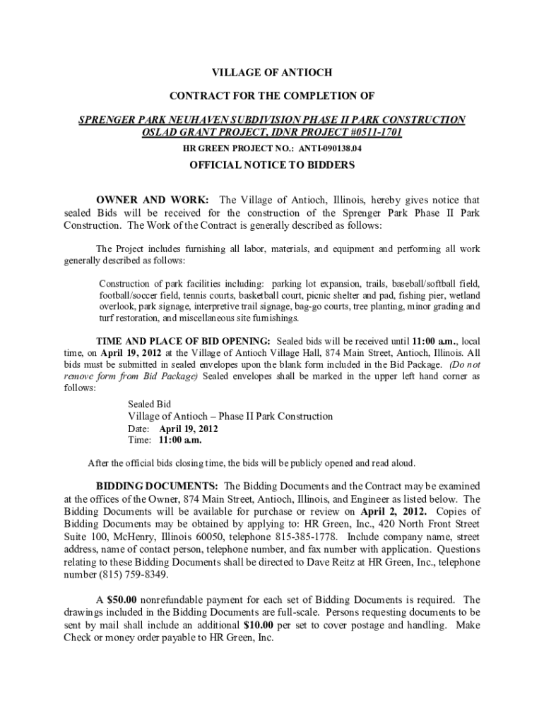 VILLAGE OF ANTIOCH CONTRACT FOR THE COMPLETION OF SPRINGER PARK HEAVEN SUBDIVISION PHASE II PARK CONSTRUCTION OSL AD GRANT PROJECT, DNR PROJECT #05111701 HR GREEN PROJECT NO.: ANTI090138.04OFFICIAL