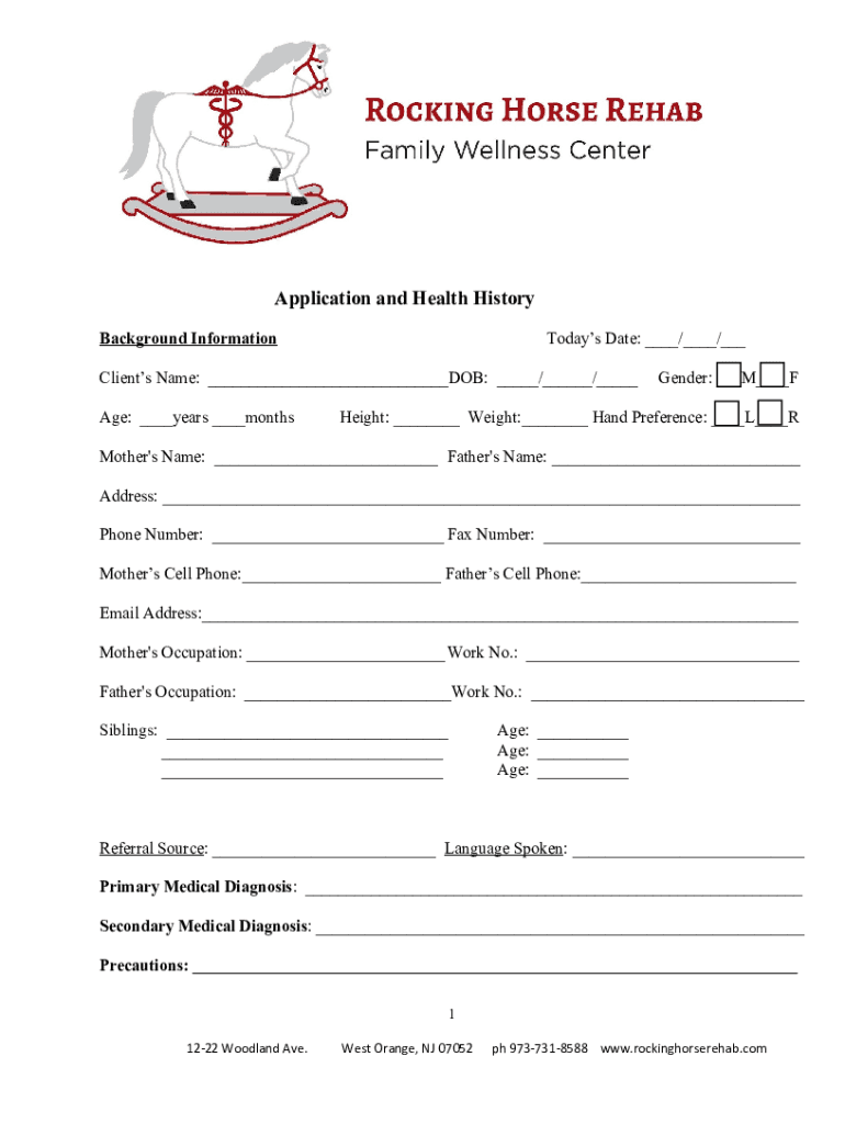 Application and Health HistoryBackground InformationTodays Date: ___/___/___Clients Name: ___DOB: ___/___/___ Age: ___years ___monthsGender: ___M___Height: ___ Weight:___ Hand Preference: ___L___Mother\'s