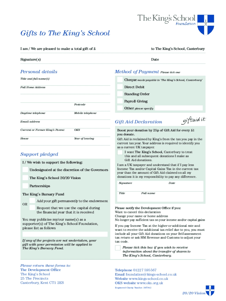 Gifts to The Kings School I am / We are pleased to make a total gift of to The Kings School, CanterburySignature(s)Interpersonal detailsMethod of PaymentPlease tick entitle and full name(s)Check made