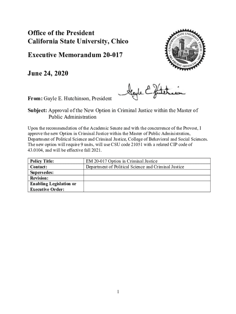 Office of the President California State University, Chico Executive Memorandum 20017 June 24, 2020, From: Gayle E. Hutchinson, President Subject: Approval of the New Option in Criminal Justice within