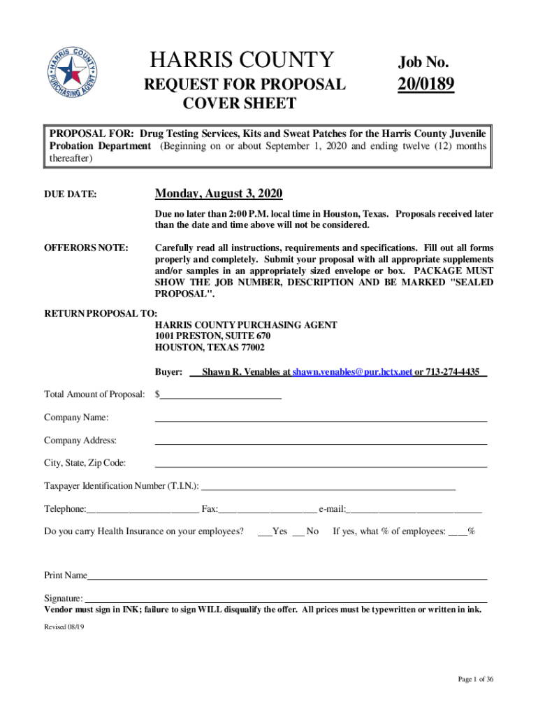 HARRIS COUNTY Job No. REQUEST FOR PROPOSAL COVER SHEET20/0189PROPOSAL FOR: Drug Testing Services, Kits and Sweat Patches for the Harris County Juvenile Probation Department (Beginning on or about