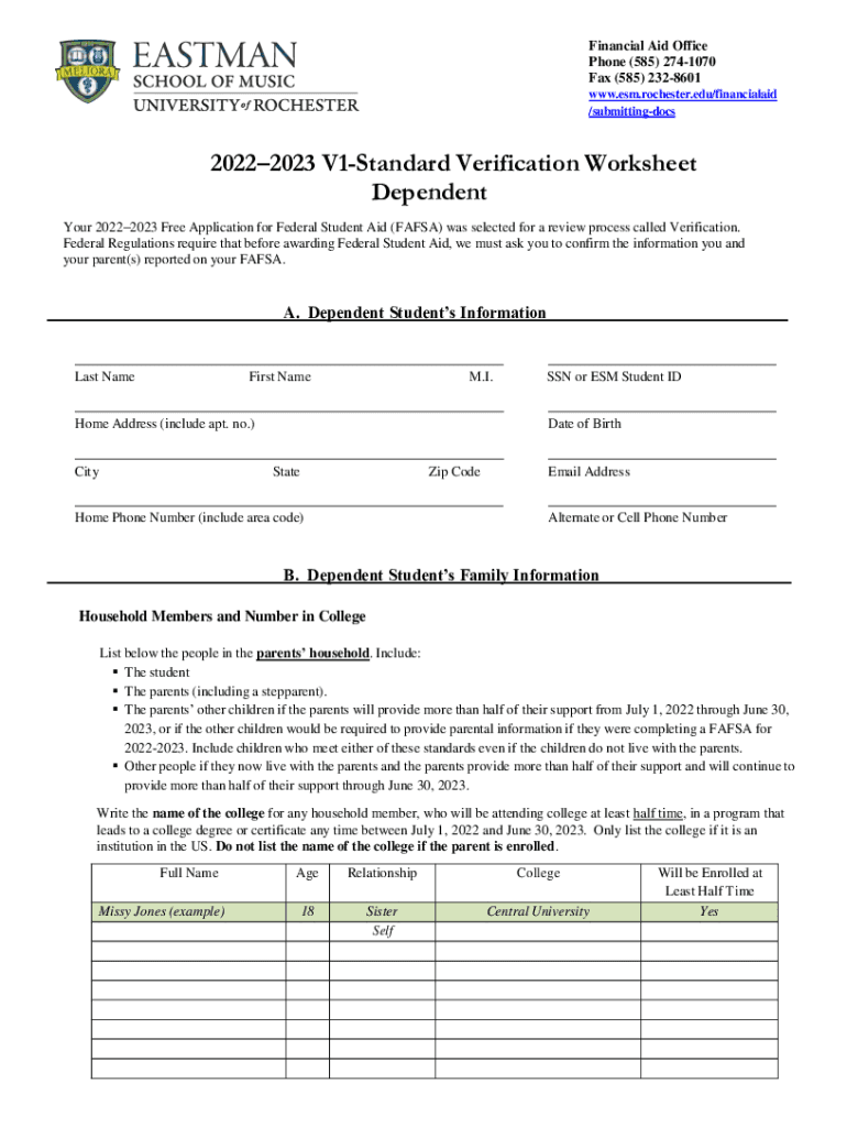 Financial Aid Office Phone (585) 2741070 Fax (585) 2328601 www.esm.rochester.edu/financialaid /submittingdocs20222023 V1Standard Verification Worksheet Dependent Your 20222023 Free Application for
