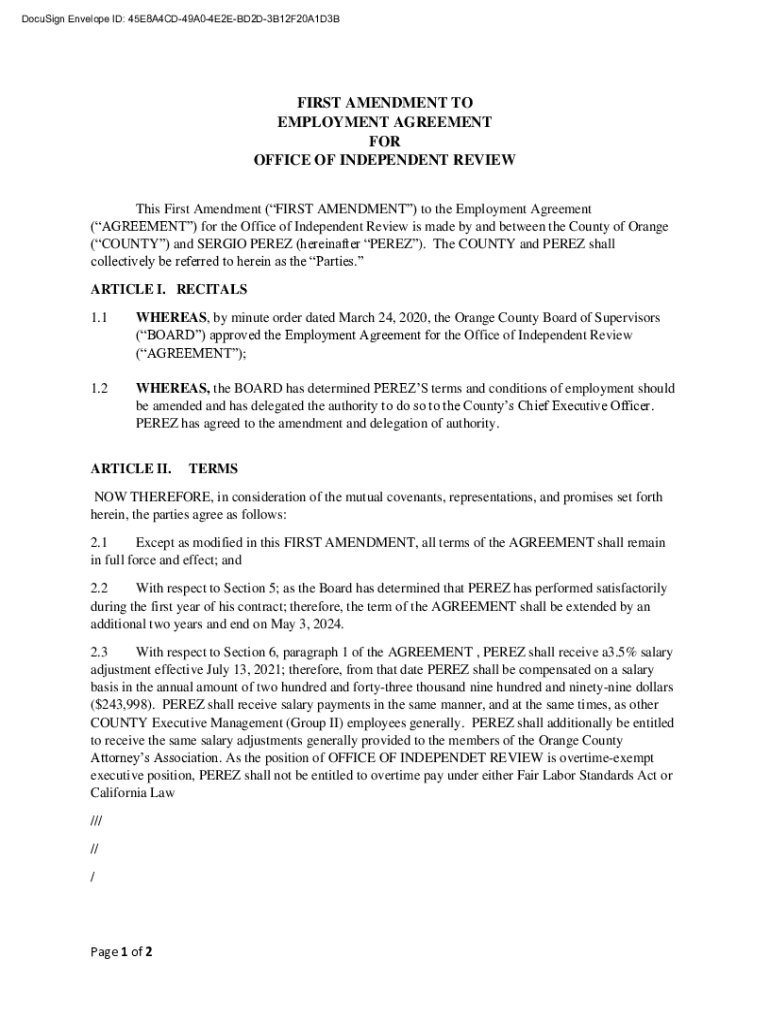 Get the free FIRST AMENDMENT TO EMPLOYMENT AGREEMENT FOR ... - ocgov.com