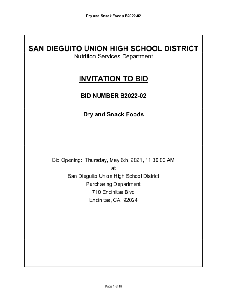 Dry and Snack Foods B202202TITLE PAGE SAN DIEGUEÑO UNION HIGH SCHOOL DISTRICT Nutrition Services DepartmentINVITATION TO BID NUMBER B202202 Dry and Snack Foods Opening: Thursday, May 6th, 2021, 11:30:00