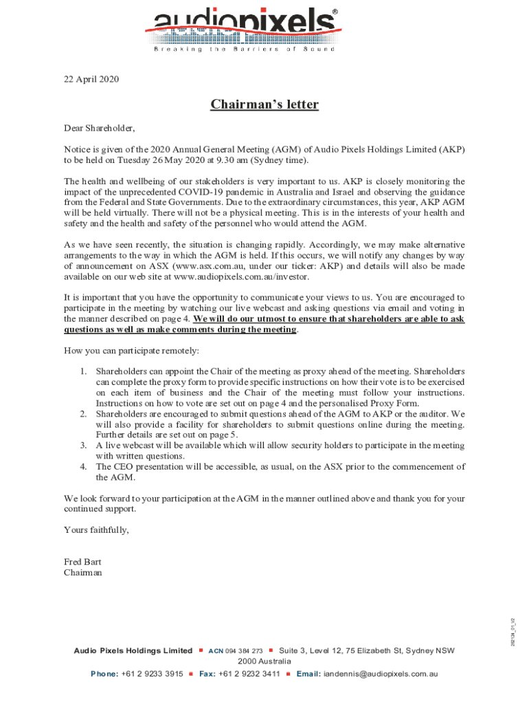 22 April 2020Chairmans letter Dear Shareholder, Notice is given of the 2020 Annual General Meeting (AGM) of Audio Pixels Holdings Limited (AKP) to be held on Tuesday 26 May 2020 at 9.30 am (Sydney