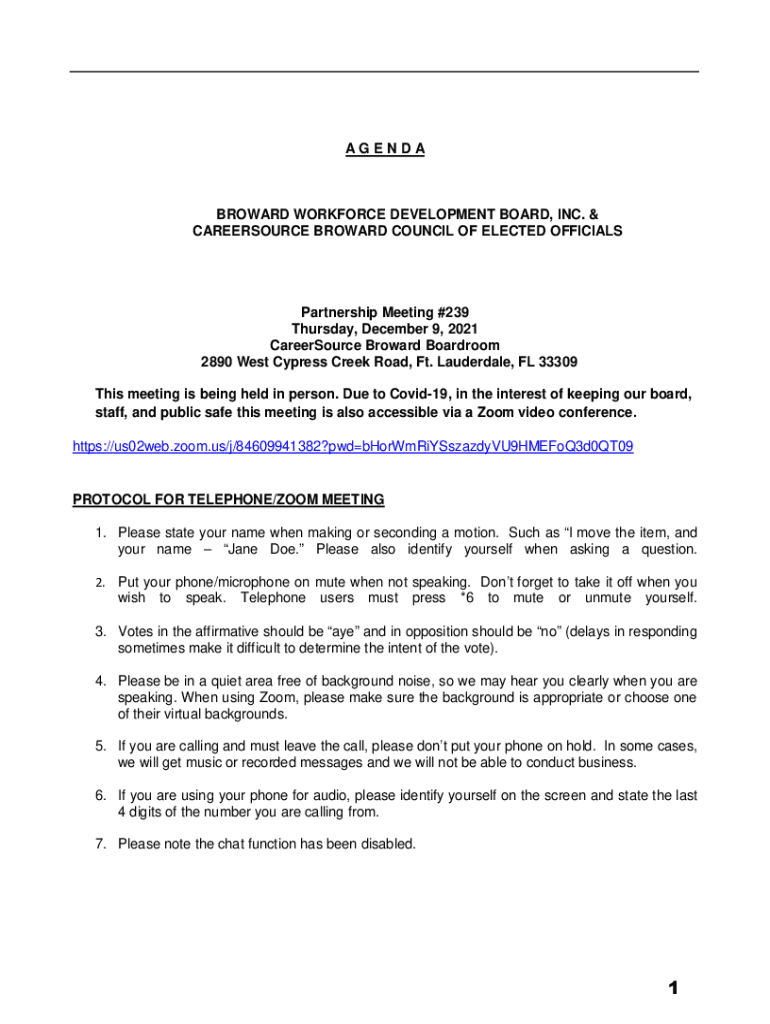AGENDABROWARD WORKFORCE DEVELOPMENT BOARD, INC. & CAREERSOURCE BROWARD COUNCIL OF ELECTED OFFICIALSPartnership Meeting #239 Thursday, December 9, 2021, CareerSource Broward Boardroom 2890 West Cypress