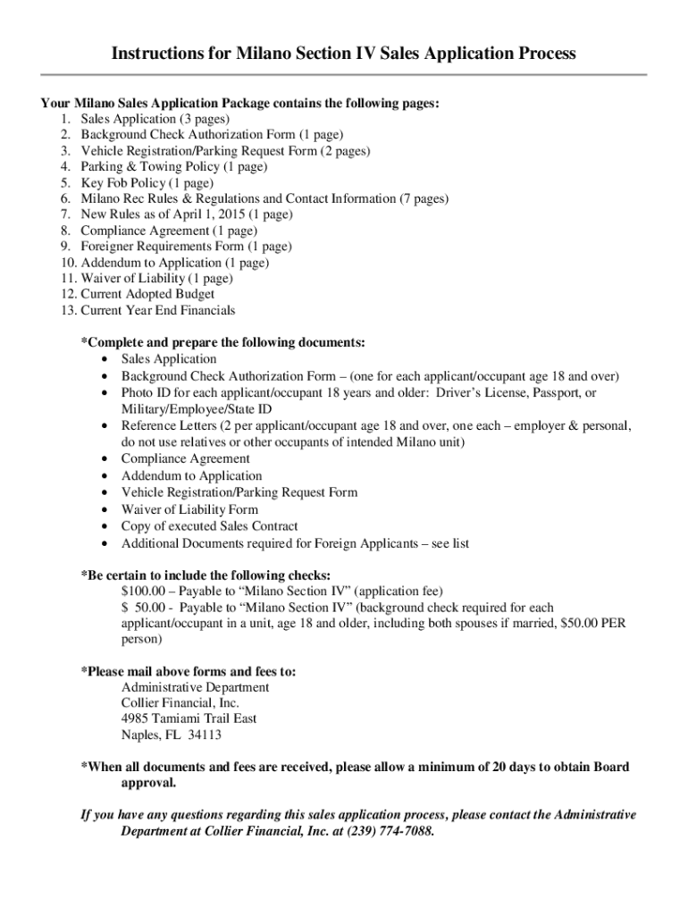 Instructions for Milano Section IV Sales Application Process Your Milano Sales Application Package contains the following pages: 1. Sales Application (3 pages) 2. Background Check Authorization Form