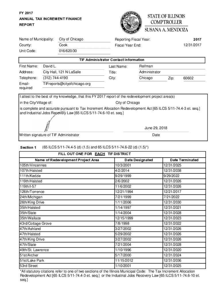 FY 2017 ANNUAL TAX INCREMENT FINANCE Reportage of Municipality:City of ChicagoReporting Fiscal Year:County:CookFiscal Year End:Unit Code:016/620/302017 12/31/2017TIF Administrator Contact Information