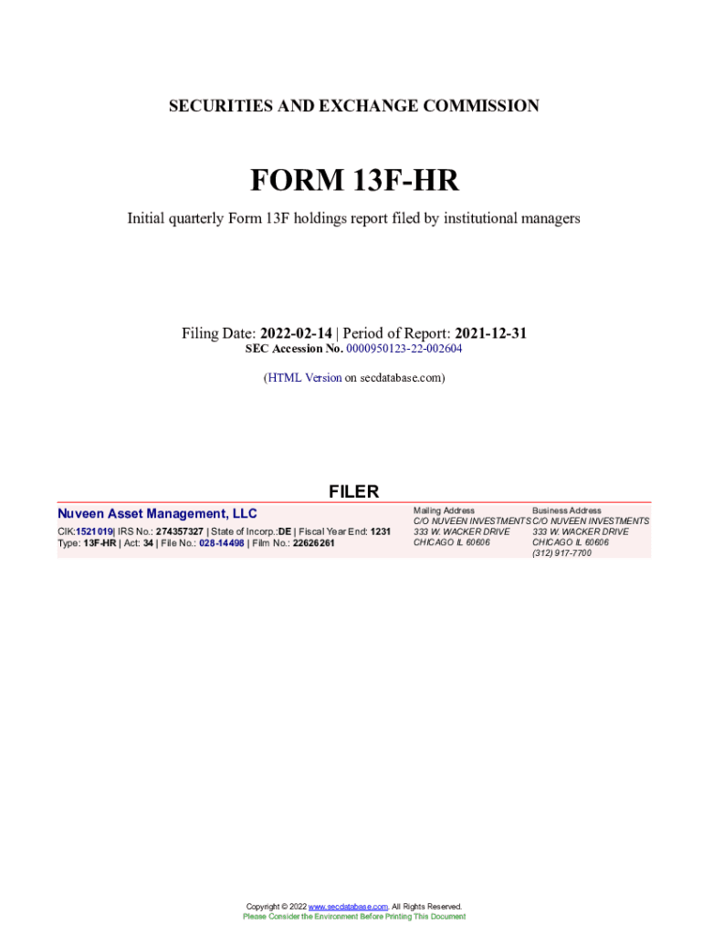 Get the free Nuveen Asset Management, LLC Form 13F-HR Filed 2022-02-14. Accession Number