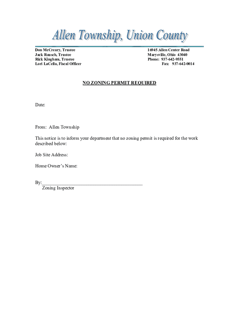 Don McCready, Trustee Jack Launch, Trustee Rick Gingham, Trustee Lori Capella, Fiscal Officer16945 Allen Center Road Marysville, Ohio 43040 Phone: 9376429551 Fax: 9376420014NO ZONING PERMIT REQUIREDDate:From:
