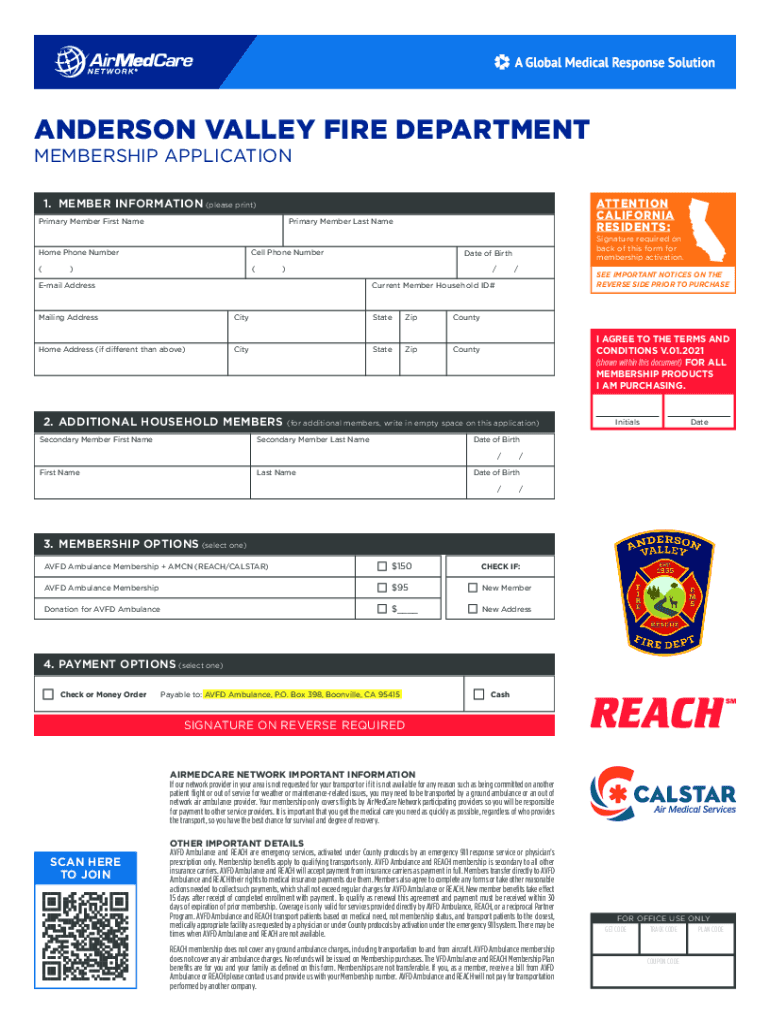 ANDERSON VALLEY FIRE DEPARTMENT MEMBERSHIP APPLICATIONATTENTION CALIFORNIA RESIDENTS:1. MEMBER INFORMATION (please print) Primary Member Last Preprimary Member First Namesake Phone Numbered Phone