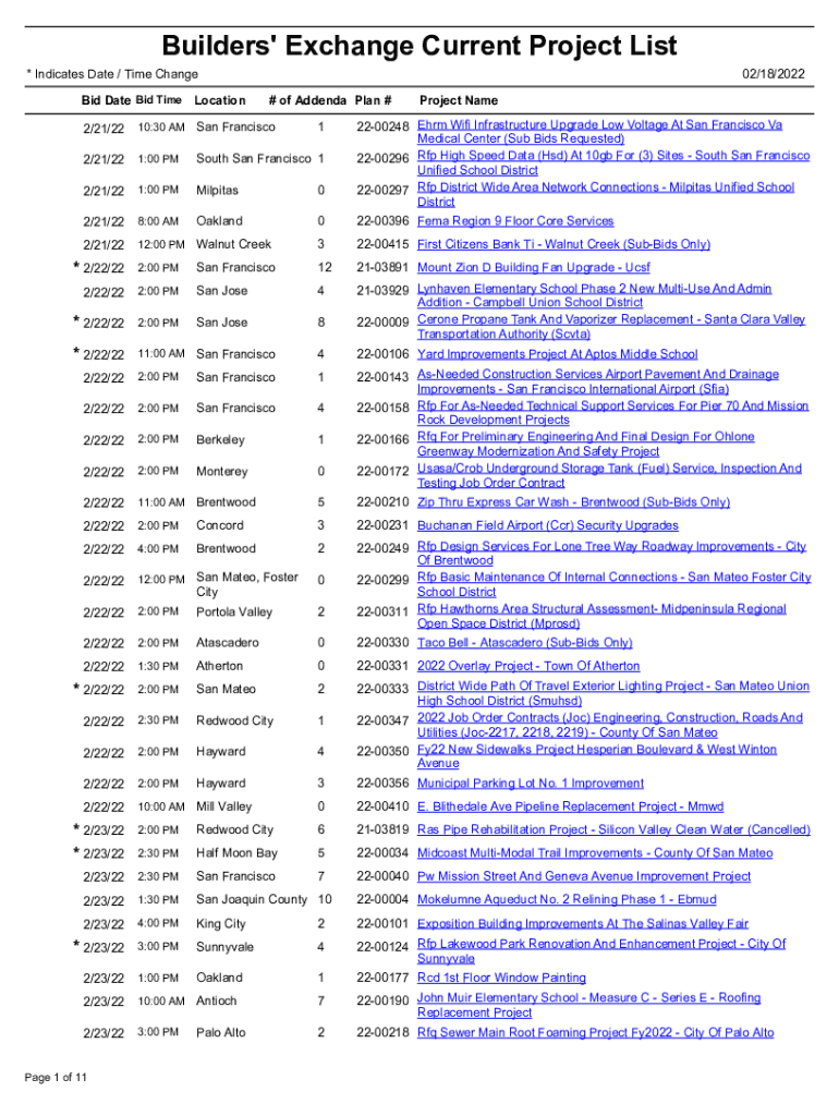 Builders\' Exchange Current Project List * Indicates Date / Time Change Bid Date Bid Time Location02/18/2022 # of Addenda Plan #2200248 HRM Wi-Fi Infrastructure Upgrade Low Voltage At San Francisco