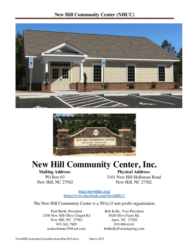 New Hill Community Center (HCC)New Hill Community Center, Inc. Mailing Address: PO Box 63 New Hill, NC 27562Physical Address: 3101 New Hill Hollman Road New Hill, NC 27562http://newhillcc.org/ https://www.facebook.com/NewHillCCThe