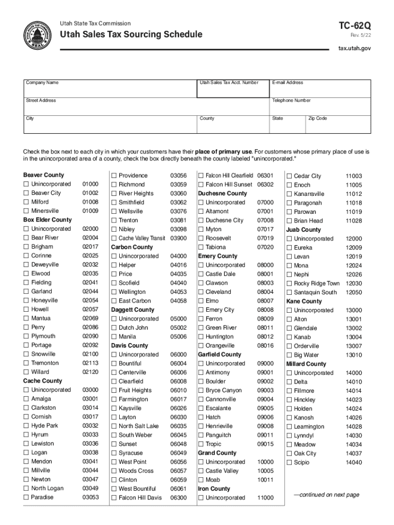 Company Name Utah Sales Tax Acct. NumberStreet AddressEmail AddressTelephone NumberCityCountyStateZip Code Check the box next to each city in which your customers have their place of primary use.