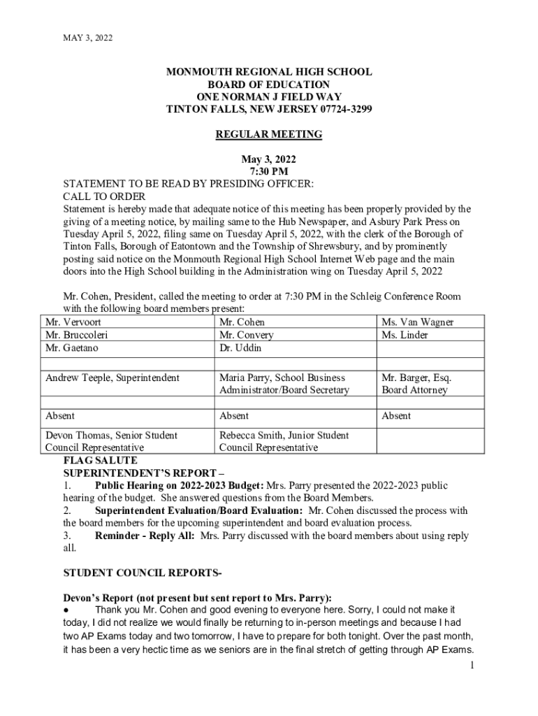 MAY 3, 2022MONMOUTH REGIONAL HIGH SCHOOL BOARD OF EDUCATION ONE NORMAN J FIELD WAY HINTON FALLS, NEW JERSEY 077243299 REGULAR MEETING May 3, 2022 7:30 PM STATEMENT TO BE READ BY PRESIDING OFFICER:
