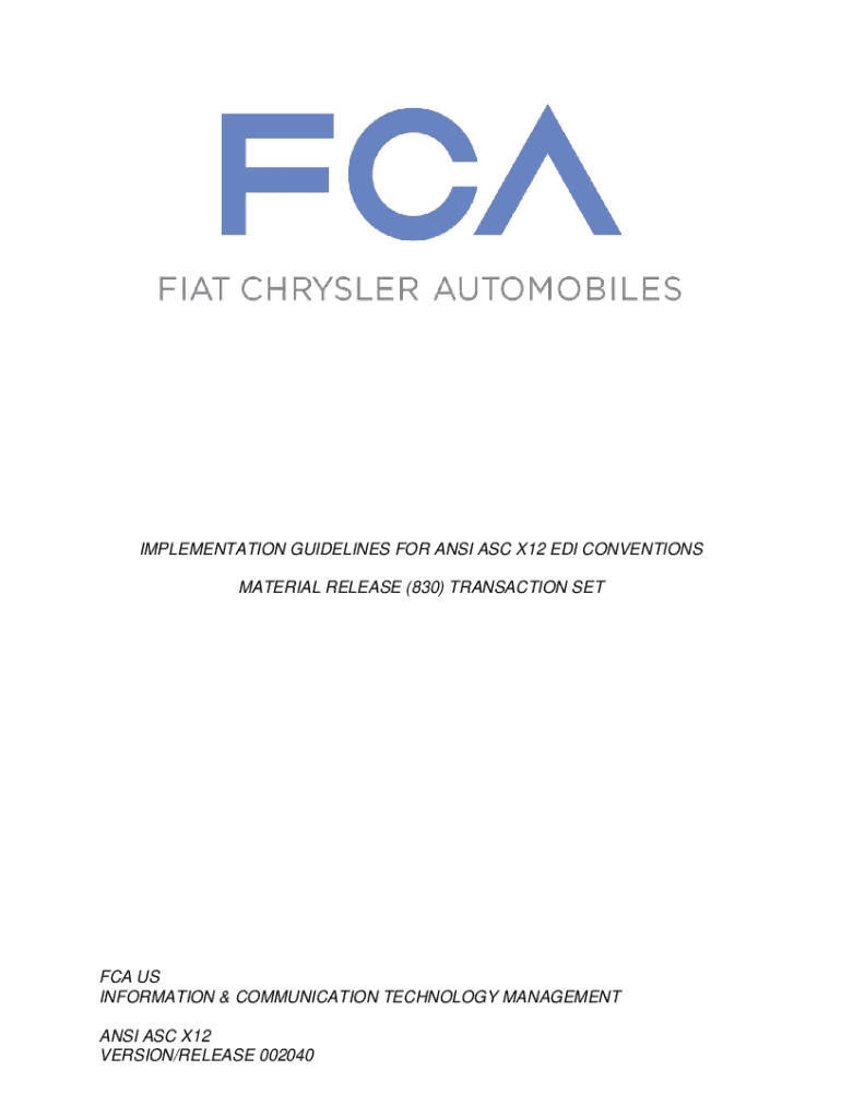 IMPLEMENTATION GUIDELINES FOR ANSI ASC X12 EDI CONVENTIONS MATERIAL RELEASE (830) TRANSACTION SET FCA US INFORMATION & COMMUNICATION TECHNOLOGY MANAGEMENT ANSI ASC X12 VERSION/RELEASE 002040FCA US