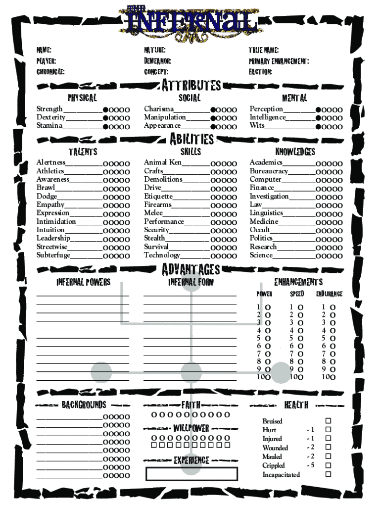 NAME: PLAYER: CHRONICLE:NATURE: DEMEANOR: CONCEPT:PHYSICALATTRIBUTES SOCIALITE NAME: PRIMARY ENHANCEMENT: FACTION:MENTALStrength ___ VOODOO Dexterity ___ VOODOO Stamina ___ OOOOOCharisma___ VOODOO