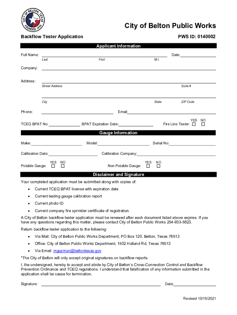 TX Backflow Tester Application - City of Belton 2021-2026 free printable template