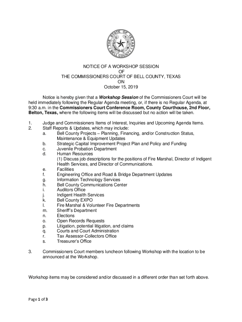 Get the free NOTICE OF WORKSHOP SESSION OF THE COMMISSIONERS COURT OF ...