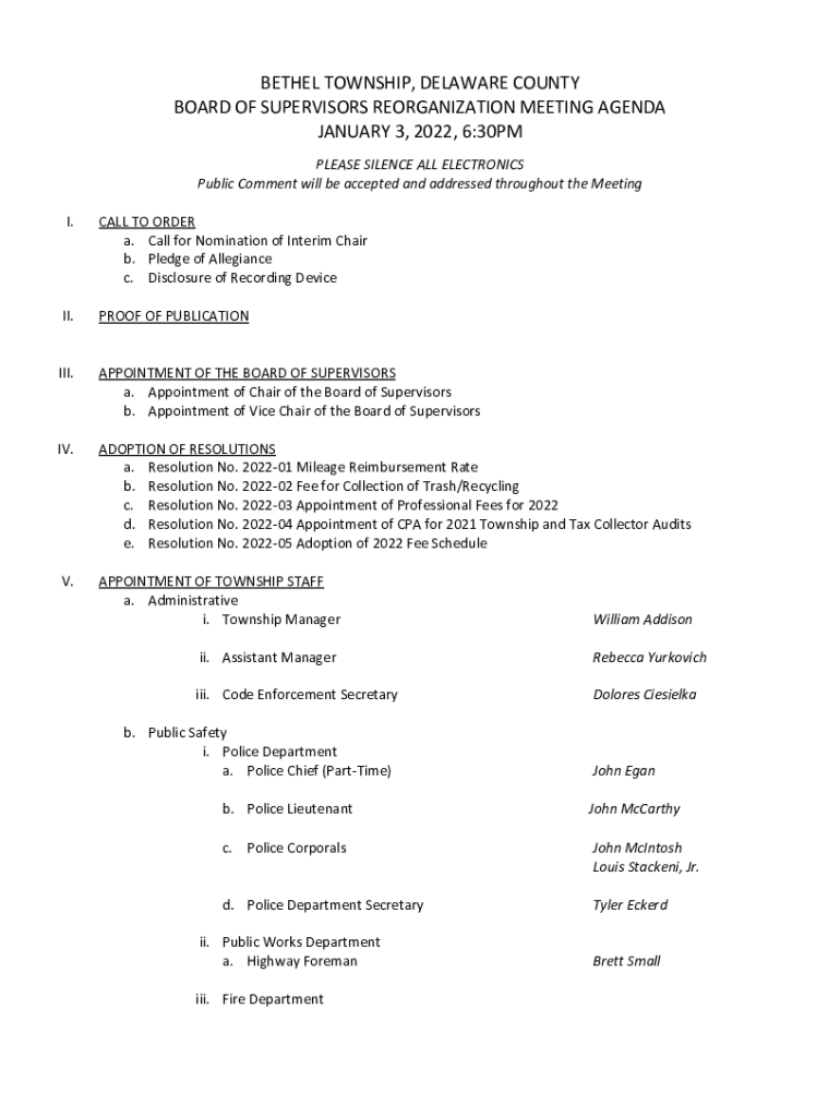 ETHEL TOWNSHIP, DELAWARE COUNTY BOARD OF SUPERVISORS REORGANIZATION MEETING AGENDA JANUARY 3, 2022, 6:30PM PLEASE SILENCE ALL ELECTRONICS Public Comment will be accepted and addressed throughout the