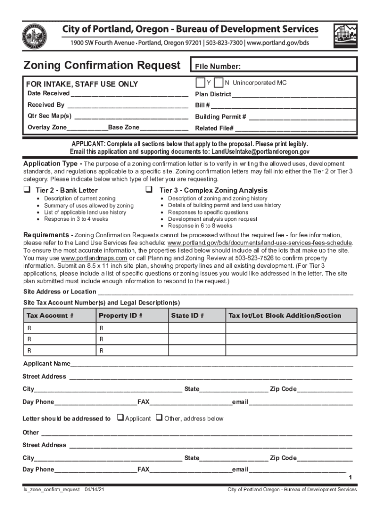 To fill out a zoning confirmation request file, the applicant must provide information about the property, including address, legal description, and proposed land use.